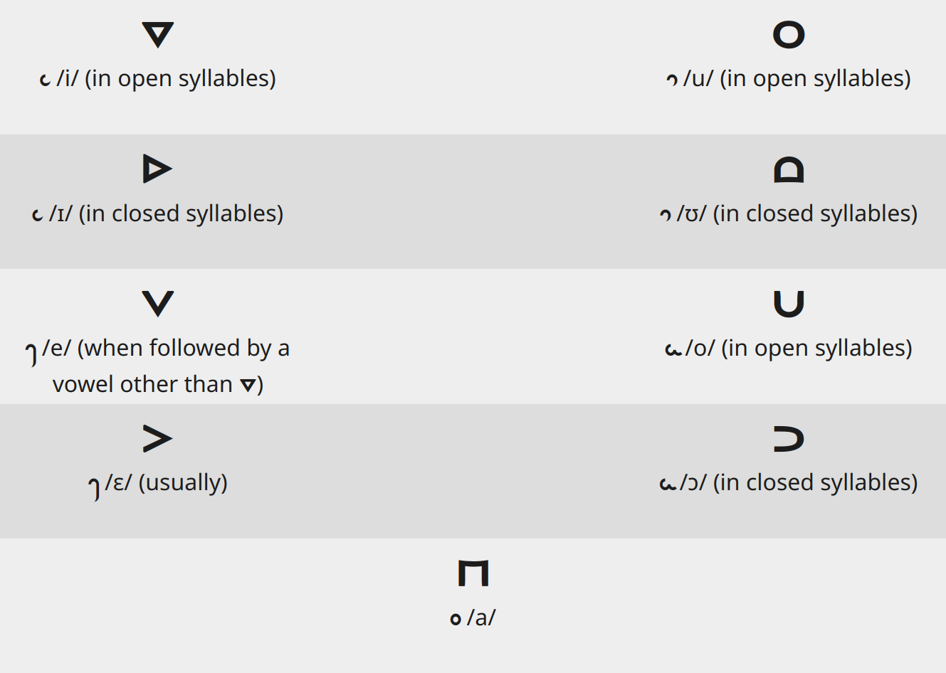 The height of the first vowel depends on the tone (all tones cause the vowel to be written high except for the broken tone), and all other vowels are written low.