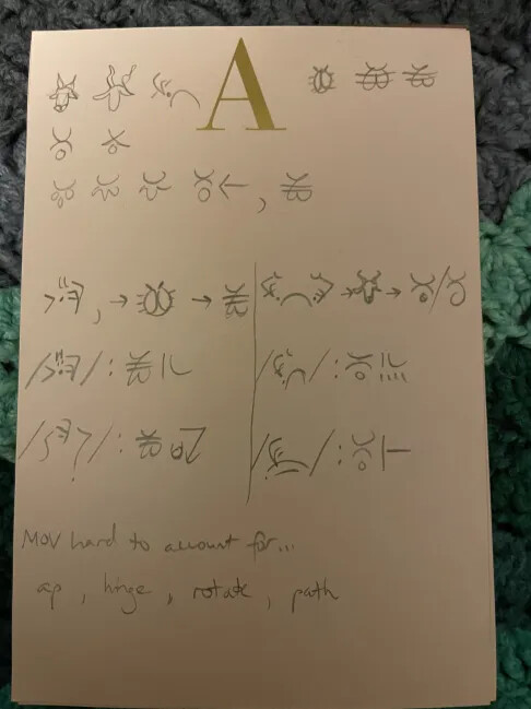 Signwriting is difficult at the best of times, and people tend to go the route of showing all of the 5 parameters, either in a line or arranged in 2d space ("projectional"). This is fine, but does feel very alphabetic, you know what I mean? They're also suuuuper featural, and I personally tend to quite dislike featural systems.